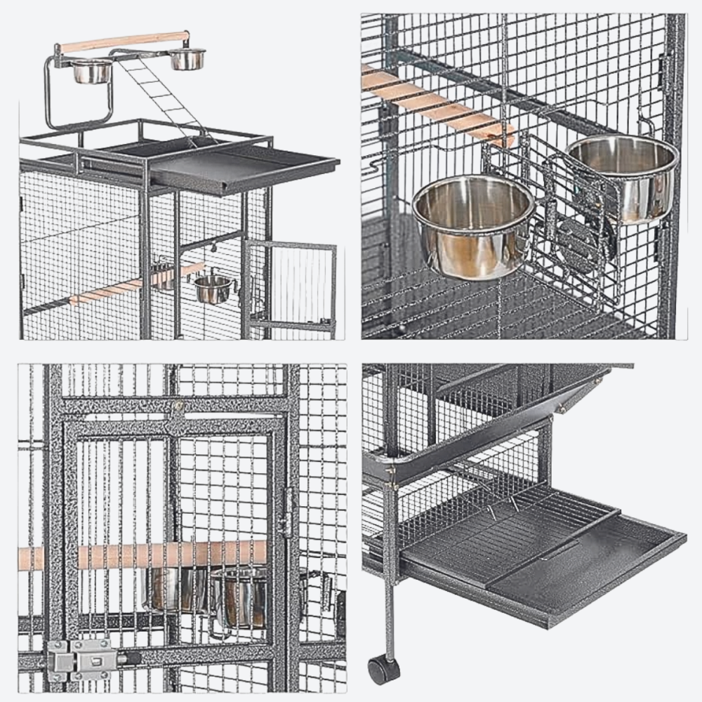 - منصة كبيرة في الأعلى مجهز بسلالم، وحامل طيور خشبي، و2 كوب طعام من الستيل مقاومة للتآكل والصدا، وصينية سحب سهلة التنظيف.